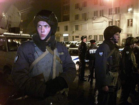 俄羅斯警方在發(fā)生劫持人質事件的劇院外高度戒備。(春風)