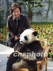 香港周凱旋基金會二十四日向成都大熊貓繁育研究基地捐贈五十萬元,終身認養(yǎng)兩只大熊貓。圖為香港周凱旋基金會的代表張培薇女士高興地與大熊貓合影留念。作者:魯彥
