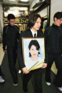 中新網(wǎng)10月24日電 于本月初在家中意外死亡的葉世榮未婚妻許韻珊,昨日在世界殯儀館設(shè)靈,今日出殯,其遺體將葬于將軍澳華人永遠(yuǎn)墳場(chǎng)。昨日靈堂門(mén)外寫(xiě)著“葉府治喪”,世榮送給Cynthia的花圈亦以“愛(ài)妻”為名,他更細(xì)心地為Cynthia戴上結(jié)婚戒指,以“丈夫”身份送“愛(ài)妻”最后一程。