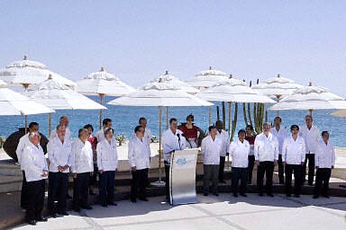 記者看到,上午八時(shí)半左右,墨西哥總統(tǒng)?怂辜丛跁(huì)場(chǎng)外一一迎候與會(huì)者。九時(shí)許,按APEC傳統(tǒng),與會(huì)領(lǐng)導(dǎo)人和代表著東道主提供的特色民族服裝拍攝“全家福”。與上屆上海峰會(huì)的中式唐裝相比,今天的“瓜亞貝拉”同樣極有“個(gè)性”,它是墨西哥東南部流行的一種傳統(tǒng)服裝,為精一色的白色,有四個(gè)胸袋。合照背景為太平洋碧藍(lán)的大海,藍(lán)白相襯,在美麗的洛斯卡沃斯留下了一道亮麗的風(fēng)景線。