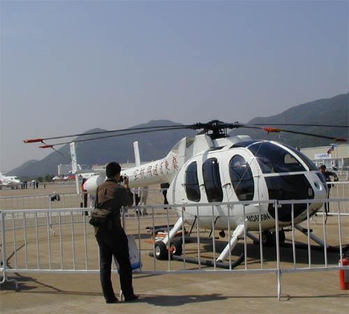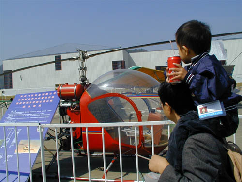 前來參觀航展的父子倆,駐足于一架超輕型直升機