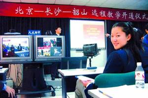 中新網(wǎng)11月7日電 昨天下午,“北京—長沙—韶山遠(yuǎn)程教學(xué)直通車”正式開通。北京人大附中、湖南長沙一中和韶山學(xué)校高二的幾十名同學(xué)在各自的遠(yuǎn)程教室上了一堂別開生面的課。這是我國首次實(shí)現(xiàn)跨省區(qū)實(shí)時(shí)交互式的遠(yuǎn)程教學(xué)。