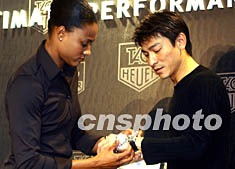 美國的“世界女飛人”瓊斯,11月7日在香港代表世界名表TAG Heuer公司向香港歌壇天王劉德華贈送TAG Heuer Link C36自動計時表。劉德華是全世界第二個獲得該款表的人士,第一個獲得者是世界高爾夫球王泰戈.伍茲。任晨鳴 攝