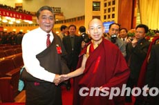 出席中國(guó)共產(chǎn)黨第十六次全國(guó)代表大會(huì)的熱地代表(左),八日在北京人民大會(huì)堂向特邀參加會(huì)議的十一世班禪額爾德尼.確吉杰布問候致意。作者:毛建軍