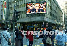 中共十六大11月8日在北京開幕,香港有線電視臺全程直播。中共中央總書記江澤民作報告時,正值香港金融心臟中環(huán)一帶緊張的上班時間,但仍然有不少市民駐足觀看。任晨鳴 攝