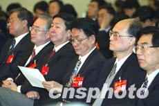 圖為財政部長項懷誠在中央國家機關(guān)代表團會場專心閱讀文件。
