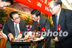 十六大代表、中共中央政治局常委李鵬九日與重慶代表一起討論十六大報(bào)告。會后,吳康明代表(右二)拿出一本影集,介紹由李鵬捐款資助的學(xué)生的學(xué)習(xí)與生活情況。作者:毛建軍