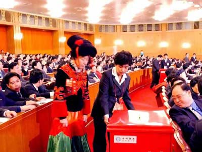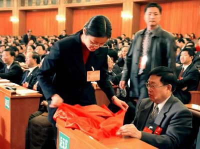 江澤民、李鵬、朱镕基、李瑞環(huán)、胡錦濤、尉健行、李嵐清已相繼在位于主席臺正中的票箱投票。同時,代表和特邀代表們也開始投票。