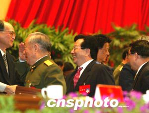 朱镕基與胡錦濤出席十六大閉幕會(huì)