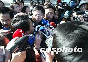 等候在北京人民大會堂外的中外記者們,十四日拼命擁擠,抓緊采訪出席中共十六大閉幕會的代表。作者:毛建軍