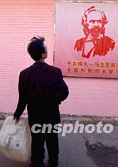 北京的一名勞動者被小街邊紅色馬克思畫像所吸引。日前閉幕的中共十六大宣布堅持馬克思主義,這位大胡子的無產(chǎn)階級革命導(dǎo)師依然是世界最大政黨的偶像。作者:賈國榮