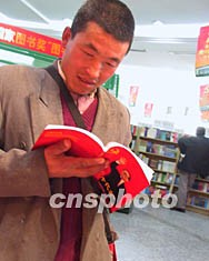 一位來京農(nóng)民十五日在北京圖書大廈閱讀介紹江澤民的文章。中共新一屆領(lǐng)導(dǎo)人今日公布,上一屆領(lǐng)導(dǎo)人仍受到人們關(guān)注。作者:王麗南