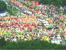 下午1時(shí),已有超過(guò)6萬(wàn)人的游行人數(shù)將中正紀(jì)念堂大門口擠得水泄不通,而且包括愛(ài)國(guó)東路與信義路上的側(cè)門,也滿是穿著綠色背心的農(nóng)漁民,不斷揮舞著“支持改革,反對(duì)消滅”的標(biāo)語(yǔ)旗幟,不少鄉(xiāng)鎮(zhèn)的農(nóng)漁民更帶著大鼓、大鑼敲打助勢(shì),讓人感受到農(nóng)漁民總動(dòng)員的龐大氣勢(shì)。