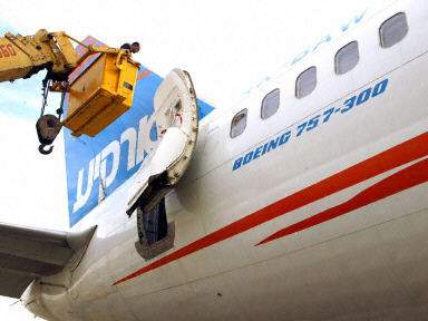 機場工作人員在檢查波音757客機有無受損