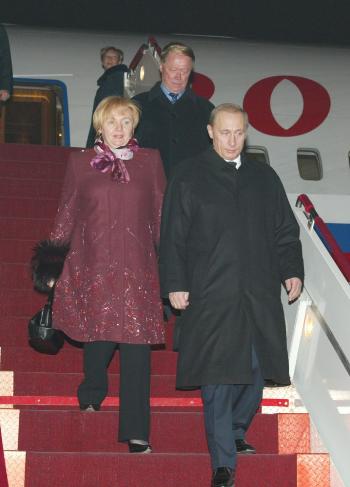 中國外交部副部長劉古昌、中國駐俄羅斯大使張德廣和夫人鄭淑蘭、俄羅斯駐華大使羅高壽等在專機(jī)舷梯旁迎候普京一行。普京總統(tǒng)夫人普京娜等陪同人員同機(jī)抵達(dá)。兩名中國女青年在機(jī)場向普京總統(tǒng)夫婦獻(xiàn)花。