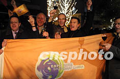 十二月三日,中國(guó)等二○一○年世博會(huì)五個(gè)申辦國(guó)的形象大使身著民族服裝在摩納哥國(guó)際展覽局會(huì)議場(chǎng)館外友好合影。作者:崔煜芳