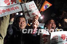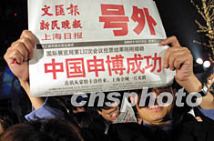 三日晚,在摩納哥夢(mèng)特卡洛舉行的國(guó)際展覽局第132次會(huì)議上,中國(guó)上海通過激烈竟?fàn)帿@得2010年世界博覽會(huì)主辦權(quán),當(dāng)中國(guó)申博成功的喜訊從蒙特卡洛傳來的時(shí)候,上海全城沉浸在一片歡樂之中。圖為申城市民在為中國(guó)申博成功歡呼。作者:湯彥俊