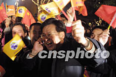 三日晚,當(dāng)中國(guó)上海申博成功的喜訊從蒙特卡洛傳來的時(shí)候,上海全城沉浸在一片歡樂之中。圖為申城市民在慶祝中國(guó)申博成功。作者:湯彥俊