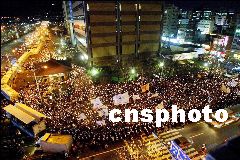 今天下午3時,漢城各社會團(tuán)體和大學(xué)生7000人在市中心舉行追悼會,譴責(zé)美軍裝甲車軋死2名韓國女中學(xué)生。韓國大國家黨總統(tǒng)候選人李會昌出席追悼會,并再次要求美總統(tǒng)布什親自道歉和修改“駐韓美軍地位協(xié)定”。追悼會后,集會者走上街頭舉行了大規(guī)模燭光游行。目前已有近3萬人聚集在漢城市中心,并徒步向美國駐韓使館移動。韓國防暴警察已進(jìn)入緊急警備狀態(tài)。目前,市中心的交通已經(jīng)癱瘓,燭光游行正在平穩(wěn)舉行,沒有發(fā)生暴力事件。