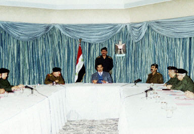 12月7日,伊拉克總統(tǒng)薩達(dá)姆(中)在巴格達(dá)主持內(nèi)閣會議。薩達(dá)姆就伊拉克1990——1991年間占領(lǐng)科威特一事向科威特人民表示道歉的講話。這是薩達(dá)姆首次就入侵科威特表示道歉。