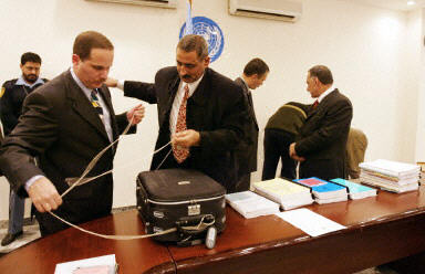 伊拉克政府7日向在伊拉克的聯(lián)合國武器核查小組負責人遞交了有關伊拉克大規(guī)模殺傷性武器研制情況的報告。這份報告將用聯(lián)合國專機運送到位于紐約的聯(lián)合國總部和位于維也納的國際原子能機構。圖為伊拉克官員捆綁遞交聯(lián)合國的武器核文件。