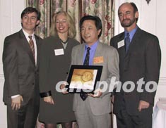 中國基因研究專家楊煥明(左三)及其研究小組今年四月在《科學》雜志發(fā)表《水稻基因組工作框架圖》,在世界上首次將完整的水稻基因組草圖序列向公共數(shù)據(jù)庫公開。楊煥明因此被《科學美國人》被評為年度科研領袖人物,十日在紐約接受頒獎。作者:趙海燕