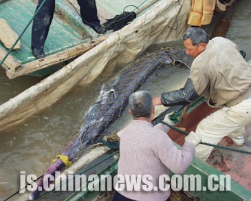 中新網(wǎng)南京12月12日電(記者陳光明 丁東升)冬日下的長(zhǎng)江江面依然是寒風(fēng)凜冽。南京下關(guān)漁政碼頭的江岸邊,今天上午站滿了翹首遠(yuǎn)望的市民——他們關(guān)切和憂慮的目光投向江邊一艘漁船邊掛著的魚網(wǎng)里邊的“國(guó)寶”級(jí)動(dòng)物——白鱘。這是漁民孫永來昨天下午二時(shí)左右在長(zhǎng)江下關(guān)潛洲以北的江面上捕捉到的。