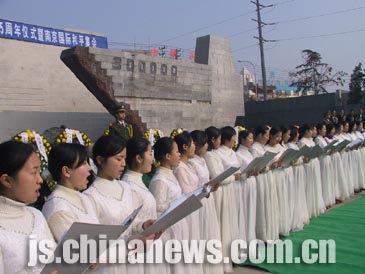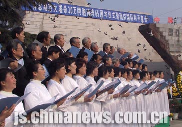 中新江蘇網(wǎng)12月13日電 (記者 王國安)今天上午,侵華日軍南京大屠殺遇難同胞紀(jì)念館的悼念廣場(chǎng)上響起“和平之聲”——在這里參加“悼念南京大屠殺三十萬同胞遇難六十五周年儀式暨南京國際和平集會(huì)”的三千名各界人士齊聲高唱《五月的鮮花》、《紫金草,和平的花》、《和平頌》,用歌聲表達(dá)了呼喚和平、維護(hù)和平、熱愛和平、促進(jìn)發(fā)展的強(qiáng)烈愿望。