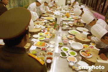 解放軍總參謀部十七日在北京舉行烹飪技術(shù)比賽,以促進(jìn)部隊(duì)生活水平的提高。解放軍部隊(duì)的伙食正在向著科學(xué)型、營(yíng)養(yǎng)型轉(zhuǎn)變。作者:宋吉河