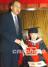 華僑大學(xué)授予許東亮先生名譽(yù)博士學(xué)位證書儀式十二月二十三日晚在香港舉行。國(guó)務(wù)院僑務(wù)辦公室副主任劉澤彭,為八十七歲高齡的許東亮博士頒發(fā)名譽(yù)博士學(xué)位證書。錢興強(qiáng) 攝