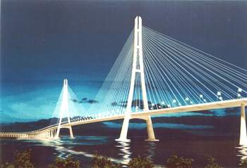該橋全長(zhǎng)約十五點(diǎn)六公里,主跨跨徑六百四十八米,設(shè)計(jì)為六車(chē)道高速公路。工程投資概算二十九點(diǎn)六億元,工期四年,計(jì)劃于二00六年底建成通車(chē)。