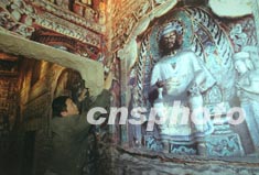 包括大同云崗石窟在內(nèi)的中國二十八處世界自然、文化遺產(chǎn)復(fù)制品歲末將在北京集中展出,以紀念《世界遺產(chǎn)公約》簽訂三十周年。圖為工作人員在云崗石窟展區(qū)作最后的布置。作者:張勤