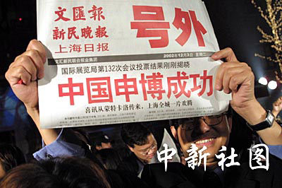 三日晚,在摩納哥夢(mèng)特卡洛舉行的國(guó)際展覽局第132次會(huì)議上,中國(guó)上海通過(guò)激烈竟?fàn)帿@得2010年世界博覽會(huì)主辦權(quán),當(dāng)中國(guó)申博成功的喜訊從蒙特卡洛傳來(lái)的時(shí)候,上海全城沉浸在一片歡樂(lè)之中。圖為申城市民在為中國(guó)申博成功歡呼。作者:湯彥俊