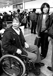 昨天下午5點40分。首都國際機場國際到港出口處。在推著大包小包行李的人流中,一個頭發(fā)稀疏的中年男子坐在輪椅上被緩緩推出。他就是在2002年4月12日以色列耶路撒冷爆炸案中受傷的中國勞工林金謀。