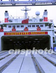 粵海鐵路火車輪渡將于七日正式開通,從連接陸地的棧橋望去,粵海鐵一號已經(jīng)整裝待發(fā)。作者:關(guān)向東