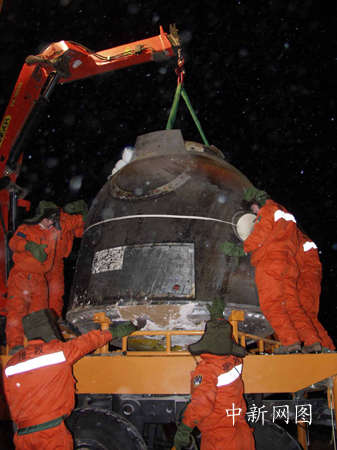 返回艙在內(nèi)蒙古草原著陸后,被吊裝入專用卡車沿公路運(yùn)往北京。孫陽(yáng) 攝