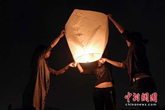 大學(xué)生點燃孔明燈為玉樹災(zāi)區(qū)人民祈福