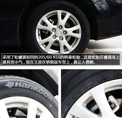 睿翼轎跑車的尾部也與普通版不同,順滑圓潤的C柱設計比普通版車型看上去更加動感,不過這樣也會損失一些后排乘客的頭部空間,后備箱采用了掀背式設計,連同后車窗一起開啟,開口很大,讓消費者可以更加從容的取放大件物品,而后備箱開啟按鈕的設計則與睿翼沒有區(qū)別。最大的遺憾就是我們在這款車型上看到的205/60 R16的韓泰輪胎,在睿翼身上就顯得有些小,搭配到睿翼轎跑上還沒有任何改進就有點說不過去了,這樣節(jié)約成本的方式實在讓人不解。