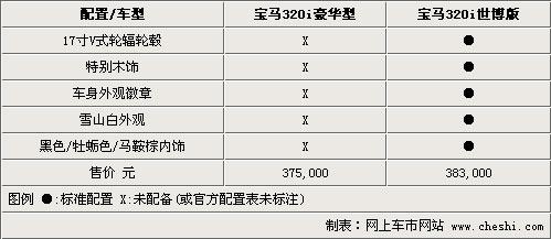 世博版320i是根據(jù)寶馬320i的豪華版衍生的,它在320i豪華版的基礎(chǔ)上增加了17寸的輪轂及輪胎、內(nèi)飾上使用了特別的棕色實木裝飾條以及白色的車身外觀色,并且在車輛尾部可以貼上一個專屬的世博徽章。售價上相比普通320i豪華版價格提升8000元,而據(jù)經(jīng)銷商方面介紹通常情況下4只同款式鋁合金輪轂的價格也在萬元左右。