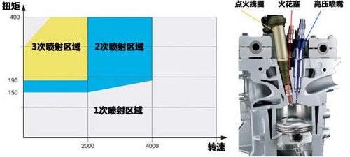配合均質(zhì)燃燒模式的缸內(nèi)直噴技術(shù),在噴射邏輯上,根據(jù)不同的發(fā)動機工況采取不同的多次噴射技術(shù),即一個發(fā)動機點火循環(huán)中進行多次噴射,更高效地形成混合氣。