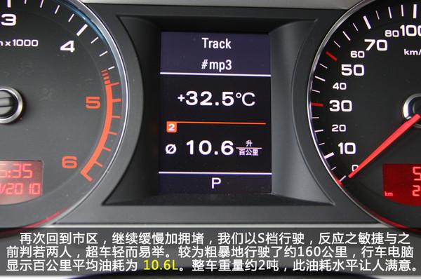 從高速路段回來,在市區(qū)內(nèi)又以S檔折騰了一翻,超車輕而易舉,小菜一碟。較為粗暴地行駛了160公里,行車電腦顯示百公里為10.6L,別忘了A6L自重已經(jīng)有1870 kg,加長車上的乘客與行李,足有2噸,依然能把油耗控制在10L左右,此表現(xiàn)讓人滿意。