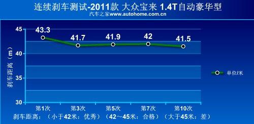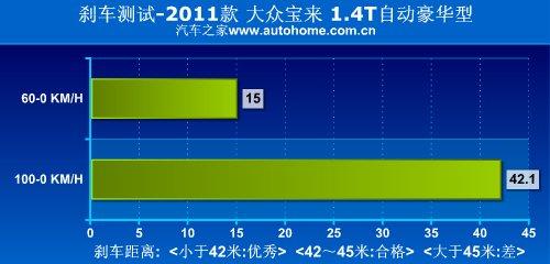 大眾的剎車系統(tǒng)一直保持著不錯(cuò)的傳統(tǒng),成績(jī)不算特別突出,表現(xiàn)會(huì)比較穩(wěn)定,寶來1.4T的剎車表現(xiàn)也是如此,42.1米的成績(jī)不算優(yōu)異,但也令人滿意。