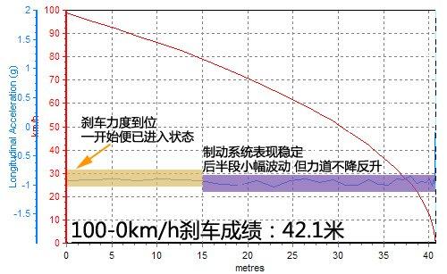 受到輪胎溫度、系統(tǒng)狀態(tài)等多方面因素影響,第一次測(cè)試成績(jī)超過了43米,不過之后寶來迅速進(jìn)入狀態(tài),連續(xù)的高強(qiáng)度測(cè)試下沒有出現(xiàn)熱衰減現(xiàn)象,表現(xiàn)一直穩(wěn)定,尤其是卡鉗的制動(dòng)力度能維持在較高水平。
