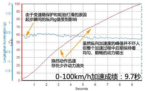 由于雙離合變速箱的自我保護(hù)程序以及輪胎打滑的影響,起步瞬間車輛的加速度并不像想象的那么高,好在之后發(fā)動(dòng)機(jī)的輸出一直很流暢,全油門狀態(tài)下變速箱會(huì)把升擋時(shí)機(jī)延遲到7000轉(zhuǎn)以后,整個(gè)沖刺過程沒有太大的波瀾,9.7秒的成績(jī)?cè)诰o湊家用車當(dāng)中已屬上乘,而按排量算起來更是沒有太多競(jìng)爭(zhēng)對(duì)手。