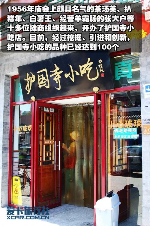 路北是“護國寺小吃店”,店面不大,卻名聲很大。因為它是護國寺廟會特色小吃的傳承者和集大成者。1956年,當廟會停辦時,為不使廟會上的特色小吃失傳,有關部門將在廟會上頗具名氣的茶湯英、扒糕年、白薯王等十多位攤商組織起來,開辦了護國寺小吃店。