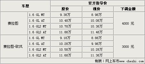 東風(fēng)悅達(dá)起亞賽拉圖是韓系車(chē)中非常經(jīng)典的一款緊湊型轎車(chē),寬大的空間,時(shí)尚的外觀以及人性化的配置使眾多消費(fèi)者都鐘情它。同時(shí)賽拉圖兩廂車(chē)型歐風(fēng)又體現(xiàn)出一種時(shí)尚的運(yùn)動(dòng)風(fēng)潮。7月初東風(fēng)悅達(dá)起亞對(duì)旗下賽拉圖歐風(fēng)、賽拉圖兩款車(chē)型的官方指導(dǎo)價(jià)進(jìn)行了調(diào)整,這兩款車(chē)分別下調(diào)了3000元和4000元。這無(wú)疑進(jìn)一步加大了賽拉圖及賽拉圖歐風(fēng)的市場(chǎng)競(jìng)爭(zhēng)力。具體車(chē)型收價(jià)見(jiàn)下表: