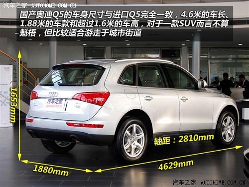 國產Q5的車身尺寸與進口Q5完全一樣,長×寬×高分別為4629×1880×1653mm,軸距為2807mm。與其同級對手如寶馬X3、奔馳GLK、沃爾沃XC60等車型尺寸接近。車內空間算是比較寬敞了。輪轂尺寸與進口版相比則明顯縮水,四款車型的輪轂依次分別為17、18和19寸,而進口版卻是全系標配了20寸的輪轂。