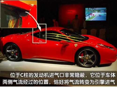 當(dāng)通過(guò)車(chē)身兩側(cè)的氣流經(jīng)過(guò)駕駛室后方的C柱時(shí)候,隱藏在C柱內(nèi)部的引擎進(jìn)氣口恰好在這里等待著新鮮的空氣。通過(guò)位于C柱內(nèi)的引擎進(jìn)氣口,發(fā)動(dòng)機(jī)將獲得充足的新鮮空氣,并且法拉利的工程師還告訴我們:當(dāng)車(chē)輛的時(shí)速達(dá)到100公里/小時(shí)開(kāi)始,由于氣流經(jīng)進(jìn)氣口以及進(jìn)氣道所產(chǎn)生的“動(dòng)態(tài)增壓”效應(yīng),會(huì)使發(fā)動(dòng)機(jī)的功率額外增加5馬力,最終實(shí)現(xiàn)570匹馬力的最大功率。