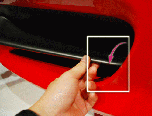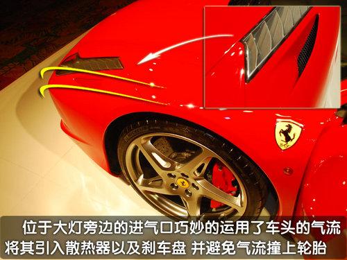 轉(zhuǎn)到車(chē)頭的上方您會(huì)發(fā)現(xiàn)在458Italia的大燈一側(cè)會(huì)有一個(gè)隱藏的通風(fēng)口,這里的設(shè)計(jì)能夠讓從車(chē)頭過(guò)來(lái)的氣流在經(jīng)過(guò)這里的時(shí)候進(jìn)入通風(fēng)口,使其變?yōu)橐嫔崞饕约扒拜唲x車(chē)系統(tǒng)的冷卻氣流,類似這樣的巧妙設(shè)計(jì)還有很多。