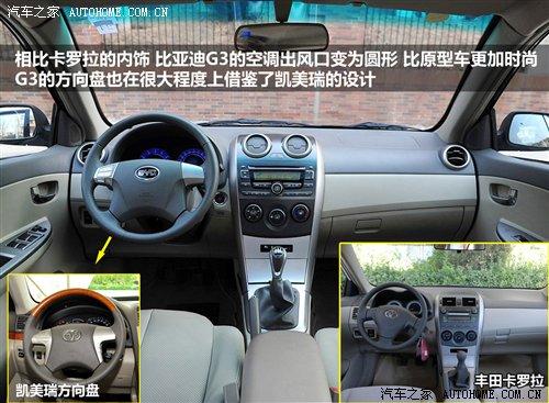 比亞迪F3的內(nèi)飾可以說是豐田花冠的翻版,因為除了方向盤的造型不同之外并沒有其他不同,便宜的售價也限制了用料和材質(zhì);作為F3升級產(chǎn)品的G3,在內(nèi)飾方面也同樣由花冠升級為卡羅拉,但并沒有照搬過來,比如空調(diào)出風(fēng)口的變化就顯得比原型車更加時尚,四輻方向盤也明顯帶有豐田凱美瑞的影子。